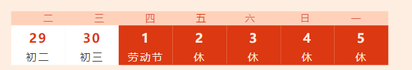 勞動節:5月1日(周四)至5月5日(周一)放假,共5天。