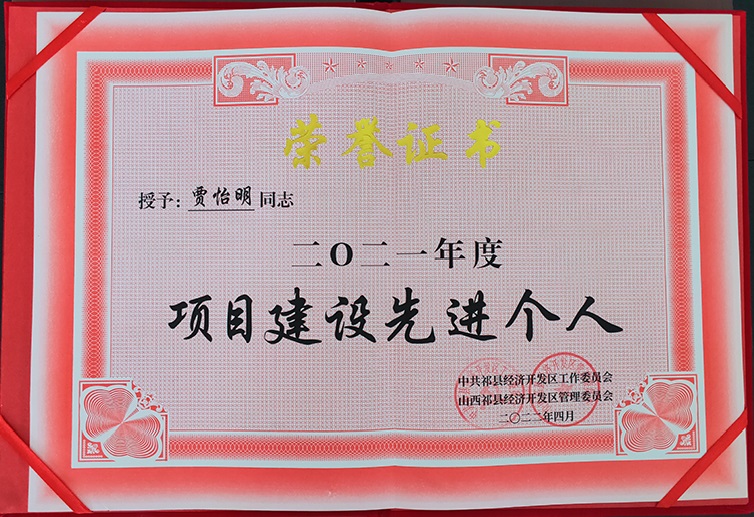 公司董事長賈怡明同志,在2021年開發區項目建設先進表彰大會上,被中共祁縣經濟開發區工作委員會和山西祁縣經濟開發區管理委員會共同授予“二〇二一年度項目建設先進個人”榮譽稱號。
